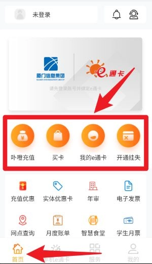 进入首页后,您可以便捷使用咔嚓充值、买卡、我的e通卡以及开通挂失等核心快捷功能,助力高效操作。