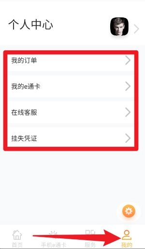 进入个人中心后,您可以进行查看订单记录、管理e通卡、联系客服以及办理挂失凭证等操作。