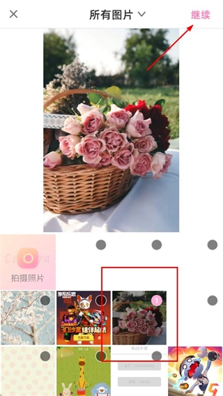 在图片页面,选定目标图片后点击继续按钮,即可进入笔记编辑页面。