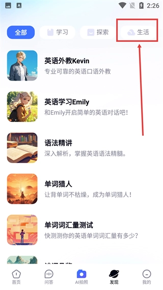 在【发现】页面,能够切换【全部】【学习】【探索】【生活】这些标签,从而获取对应板块的功能服务。