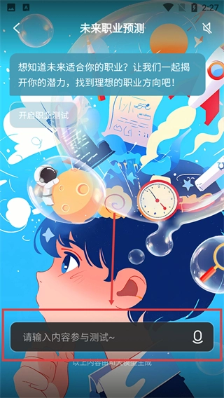 进入【未来职业预测】页面后,在输入框中填写相关内容,就能参与职业适配测试了。