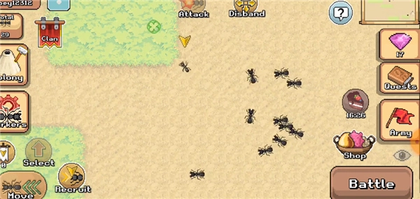 8、移动控制其他的蚂蚁去攻击其他的动物,需点击下方的battle,这里还可以查看血量;