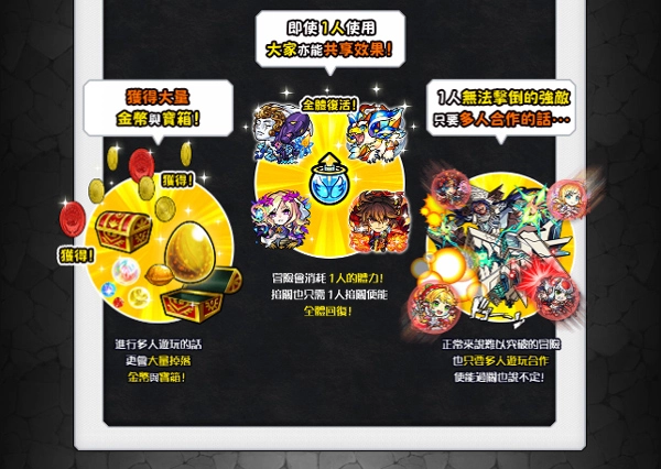 4、多人游玩时会掉落大量金币和宝箱,冒险会消耗一人的精力,开启后仅需一人操作就能让全员回复精力。对于单人无法击倒的强敌,只要多人合作,那些原本难以突破的冒险关卡,说不定就能顺利通过。