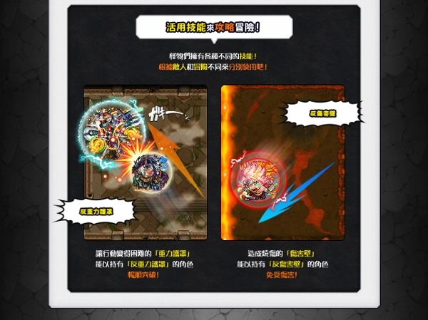 7、灵活运用技能攻克冒险,怪物们具备各类不同技能,需依据敌人特性与冒险场景的差异来分别使用。使行动受阻的重力护罩,会被拥有反重力能力的角色顺利突破;能造成烧伤效果的伤害壁,会被持有反伤害壁技能的角色无视其伤害。