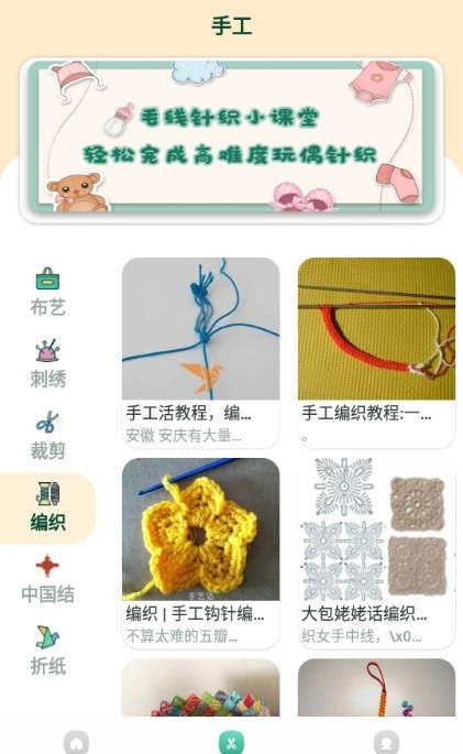 2、还涵盖布料刺绣、剪裁、编织、中国结、折纸等多种手工教学模块。