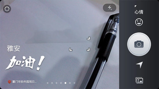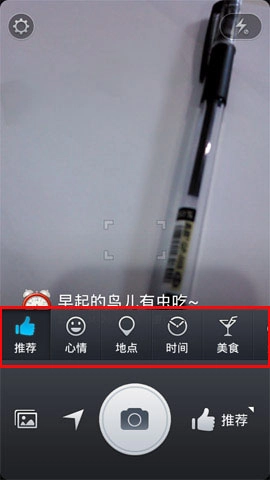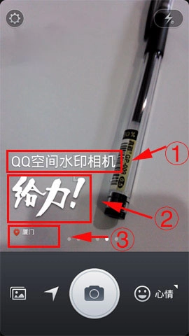 2、界面和手机系统自带的相机差不多,主要多了水印功能。用户可以通过左右滑动手机屏幕来选择水印,腾讯水印相机提供了心情、地点、时间、美食、天气五大类别的水印供用户使用。