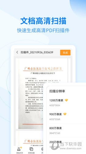 文件扫描:拍照,拍摄分辨率选择,闪光灯类型选择,手动聚焦,导入相册图片,自动智能裁剪;