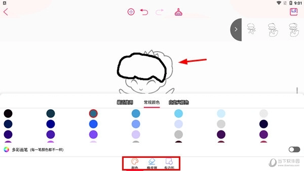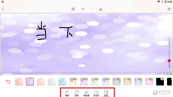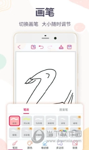 二、点击【自由画】选项,用户可在此进行自由创作,下方支持笔刷样式、色彩选择、背景设置等个性化调整。