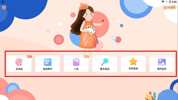 一、打开画图软件后,能看到六个基础模块,依次为自由画、画画教学、上色、魔术画画、动态画画和我的画本。其中,【上色】模块支持快速为图片添加上色效果,用户创作的所有图画则会统一存储在【我的画】中。