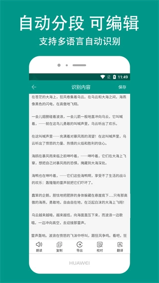 精准扫描,识别准确率高达99%,可自动清除杂乱背景,高度还原原版排版,且能同步支持中英文互译。