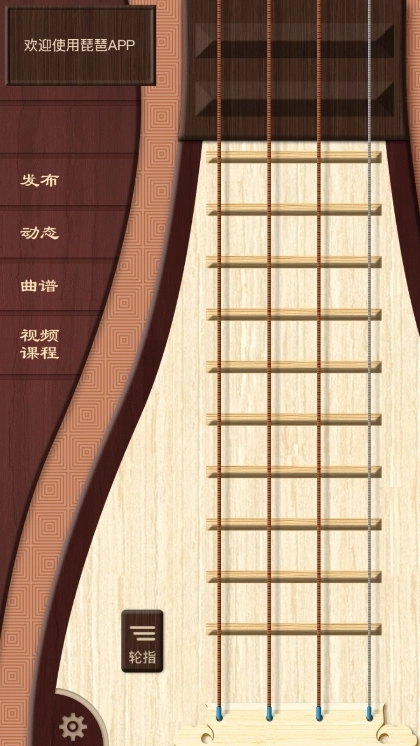 主界面为琵琶琴弦界面可直接自由弹奏,曲谱页面可查找曲子,点击曲谱进入自由鉴赏模式且下方有简谱,点击开始练习进入琵琶页面根据屏幕黑点跟弹,视频课程页面可查看琵琶及其他乐器学习视频,可发布求教帖子,设置页面可设置主界面琵琶的音色、定弦,还能开启/关闭新手模式且新手模式下所有琴弦高音一直显示。
