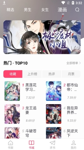 1、软件之后进入到书城精选页面,可以看到有精选、女生、男生、漫画分类,更有排行、书单、完结、热评小说漫画;