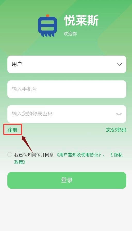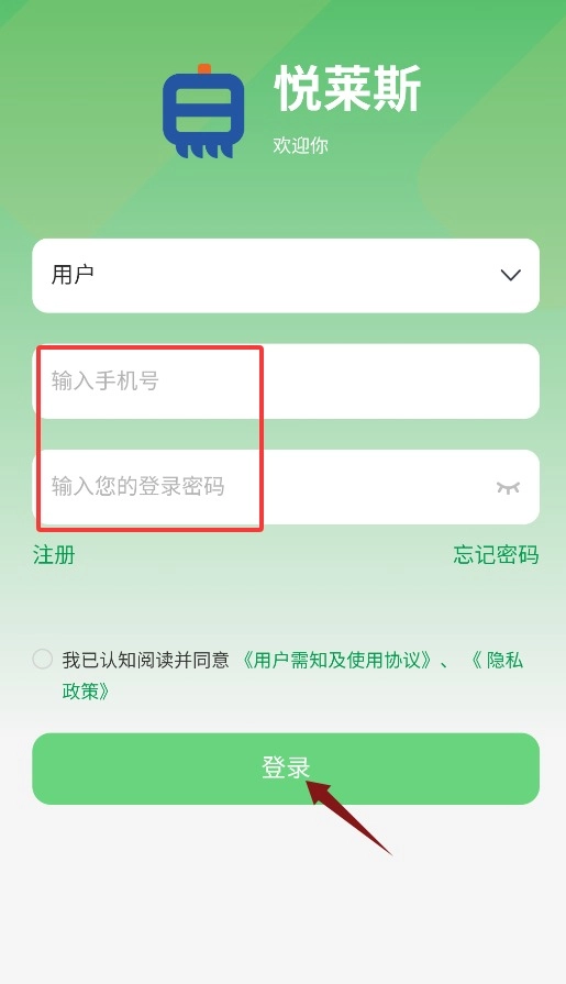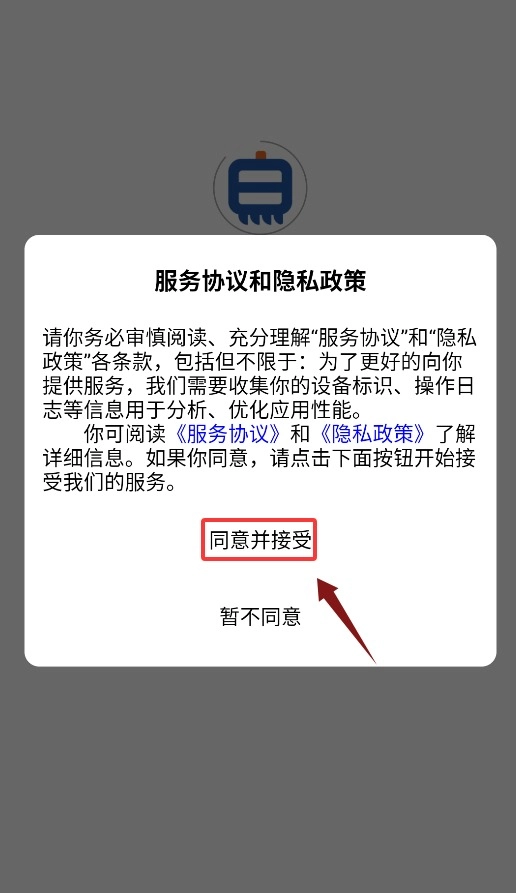 首次打开应用时,需要先点击同意服务协议与隐私政策,确认之后才能进入登录界面。