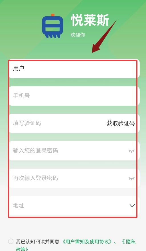 注册流程中需填写手机号、验证码,同时完成登录密码的设置与确认,以及地址等相关信息的填写。