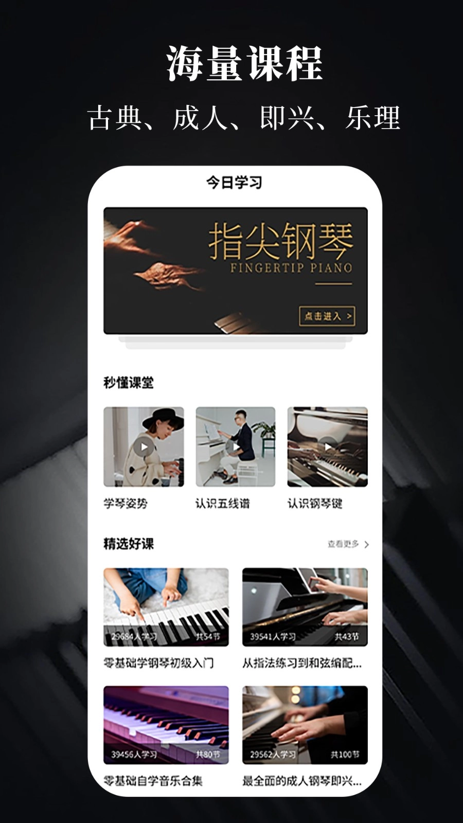 曲谱和教学视频后,无网络环境下也能正常练琴,不受场地和网络限制。