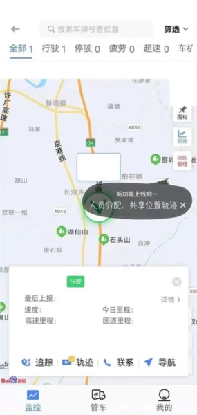 6、行车动态:用户可在此查看自己名下车辆的行车实时位置、运行轨迹、超速报警、里程统计信息。