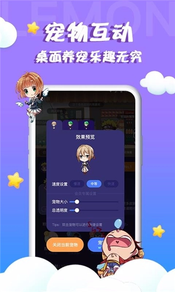 1、海量桌宠随心挑选:桌面宠物涵盖二次元人物、动漫角色、漫画主角、游戏人物、明星爱豆等多种类型,你钟爱的形象这里应有尽有,风格百变,可萌趣可爱,可酷帅有型,满足你的不同喜好。