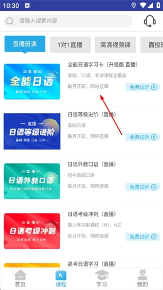 在未名天日语的首页,点击底部的课程选项,即可进入课程列表页面。