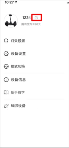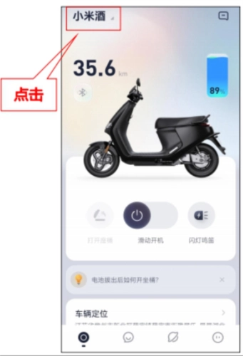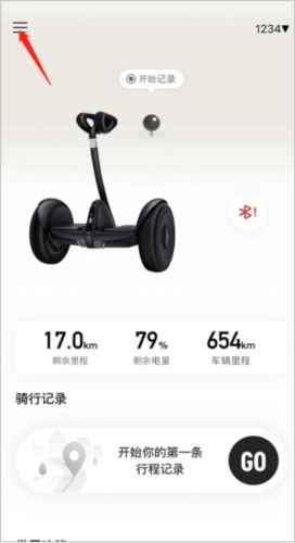 首先车辆连接九号出行后,点击设备主页面左上角按钮,然后点击添加爱车,进行车辆添加即可。
