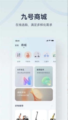 车辆提供完善新手教学、简易激活流程、动态化卡片设计、详细轨迹视频和一站式帮助中心,社交支持骑行分享、全球交流、@好友、热门话题讨论及九号俱乐部竞技,商城包含九号商城线上购车和专属N币商城兑换好物。