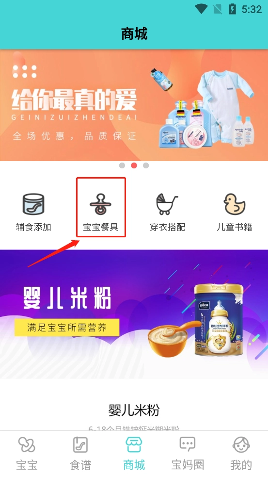 打开婴儿辅食食谱应用后,在界面里找到“商城”入口并点击它。