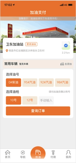 4、填写完毕后,点击【加油】,再选择油号及油枪,最后点击支付即可