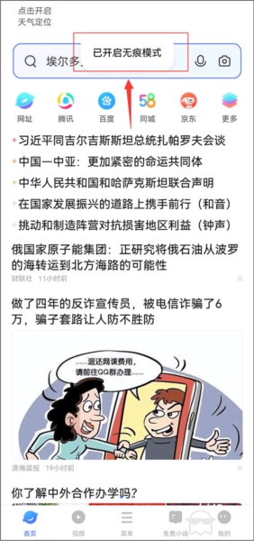在主界面或任意页面点击搜索框输入关键词可进行搜索,支持设置点按搜索功能;在菜单“设置”中进入“隐私设置”或“高级设置”找到“无痕浏览”或“隐私浏览”打开开关可实现无痕浏览;在菜单“记录”选项可查看和管理已下载文件,长按文件可进行打开、分享、删除等操作;可将常用网站添加到书签,在菜单“书签/历史”选项可查看和管理书签与历史记录;进入设置界面“首页设置”选择“自定义首页”可添加或编辑网页来自定义首页内容。