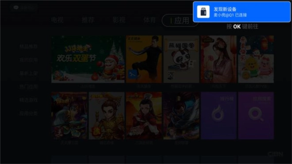 2、打开PPTV电视,将存有安装包的U盘插到电视上,系统会提示“发现新设备”,按【OK键】打开U盘;