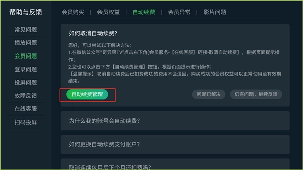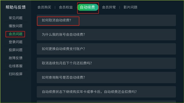 3、进入问题与反馈后,点击会员问题,选择自动续费,最后点击如何取消自动续费;