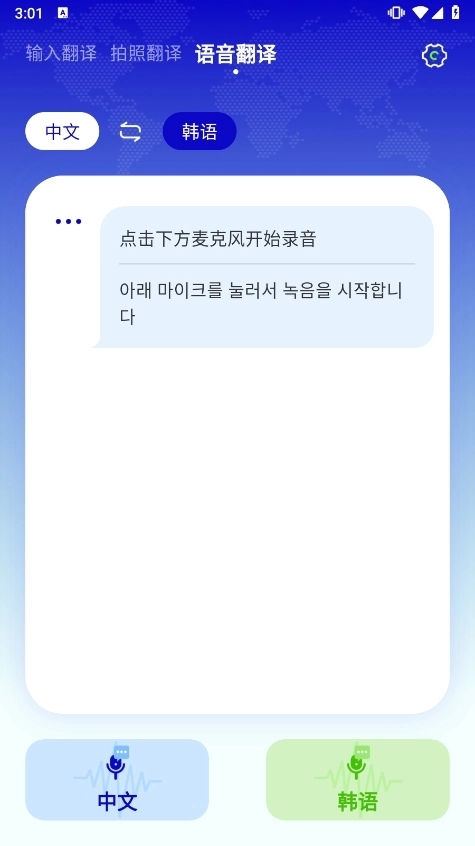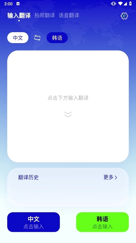在主界面选择“输入翻译”功能,输入或粘贴中文或韩文文本,选择源语言和目标语言后点击“翻译”按钮获得准确译文;选择“拍照翻译”功能,用手机摄像头拍摄韩文文本,框选区域后自动识别并翻译;选择“语音翻译”功能,按住麦克风图标说话,松开后可听到译文朗读;支持真人发音,点击译文旁喇叭图标可听准确韩文发音,且会自动保存翻译历史方便查看。
