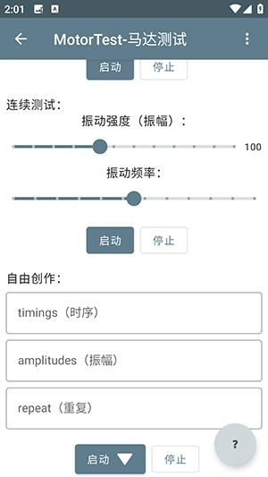 在这组测试里,设备会按照安卓系统已调校完成的四种振动模式进行振动,属于最基础的振动测试项目。需要留意的是,这组测试仅兼容安卓10及以上版本的设备。1.32及更高版本支持自定义预设振动效果,由于不同品牌手机的系统预设效果可能存在差异,需自行输入数字来尝试。根据用户@紫红小番薯 用小米10pro的测试反馈,数值20之后会出现一些类似“音乐”的振动效果,其中数值43对应的是MIUI系统默认的来电振动效果。