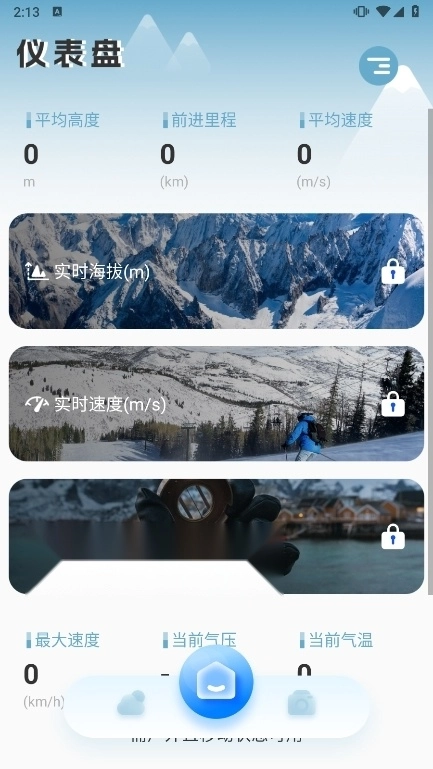 实时高度表提供当前位置的经纬度、实时温湿度天气状态等信息,水印相机支持拍摄带有海拔、经纬度及时间信息水印的照片,仪表盘通过手机GPS或传感器准确测量海拔、速度、方位等数据并随时查看里程数和平均速度。