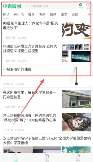 打开中青校园应用后,首页会呈现各类新闻及活动资讯,用户可以迅速定位到自己感兴趣的内容,从而提高查找效率。