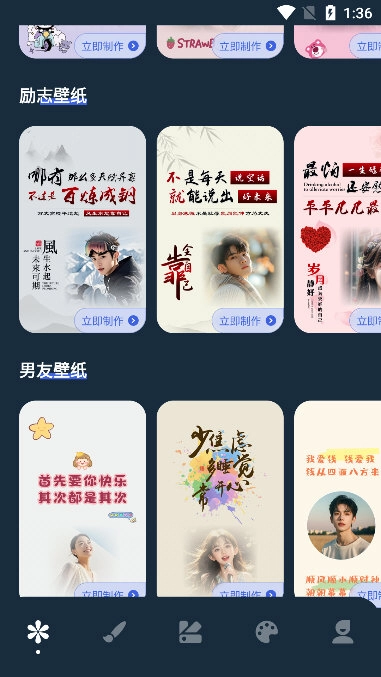 1、打开软件后点击底部创作按钮,选择壁纸制作功能,进入编辑界面后可上传本地图片作为底图,或选择平台提供的模板。
