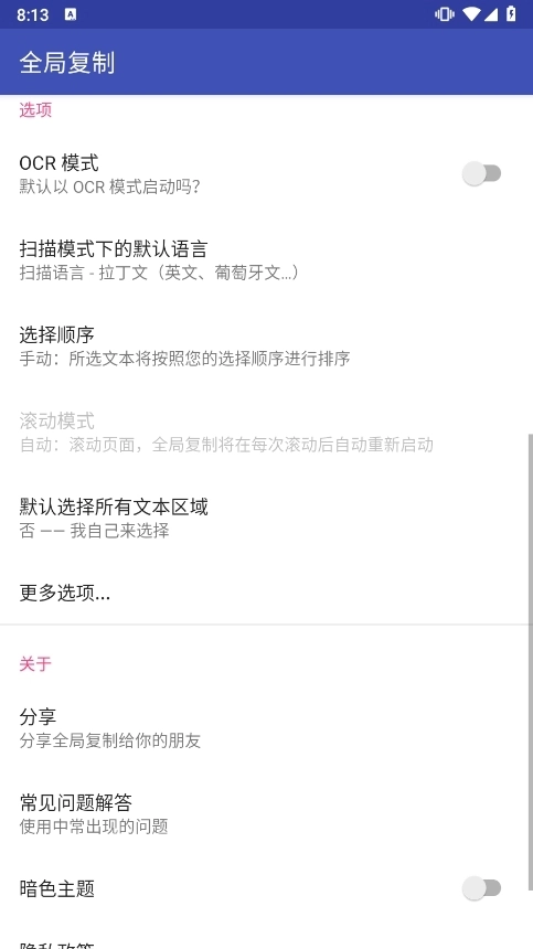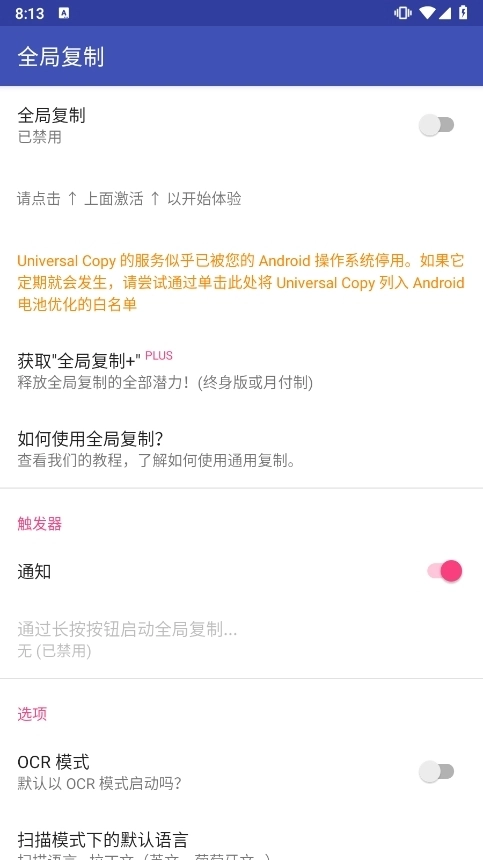 针对无法复制图片中文字的情况打造,开启辅助服务激活全局复制模式可轻松选择各种应用中想复制的文本,启用OCR模式能从图片或普通模式下无法获取文本的场景中识别复制文本。
