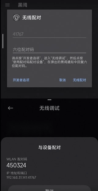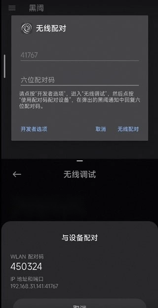3、打开黑阈,滑动到最右栏,选择打开黑阈,软件提示打开开发者选项,开启usb调试,开启无线调试,选择配对码链接,这个时候分屏打开黑阈,软件就会提示无线链接,输入配对码;