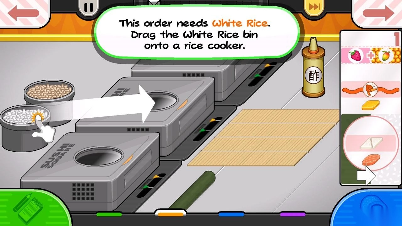按照系统给出的引导提示,点击相应的区域,就可以动手开始制作寿司了。