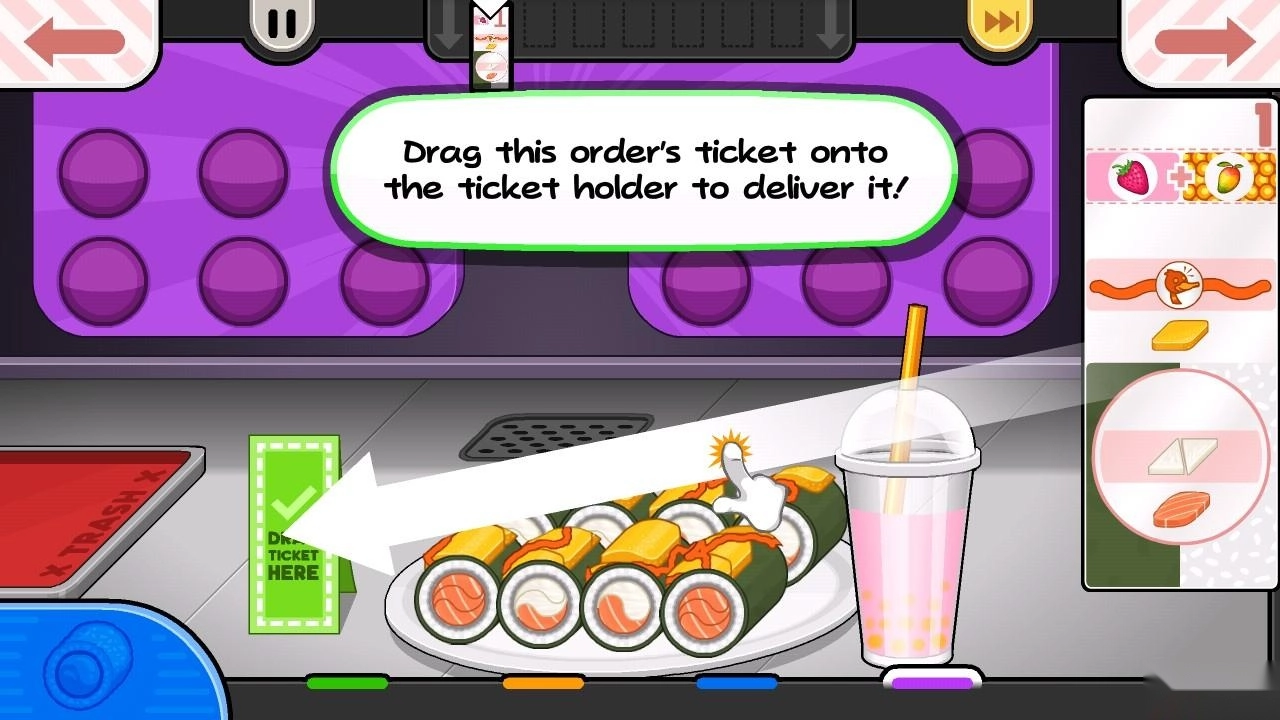 顾客的详细订单内容会在屏幕右侧呈现,你要按照要求制作相应的寿司和饮品。