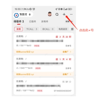 2.登录成功后,按如下步骤操作:点击右上角的“+”号,新建一个揽收任务。(温馨提示:若已有待取件,可直接点击该待取件,无需新建任务,第3步操作可跳过)