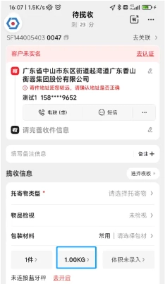 4.揽收任务创建完成后,界面显示如下,点击图中标注的“1.00kg”区域,即可进入寄托物信息界面,接着点击“去开启”按钮,开启蓝牙功能,为连接电子秤做好准备。