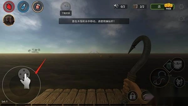 如果想在木筏和水中移动,使用操纵杆控制;