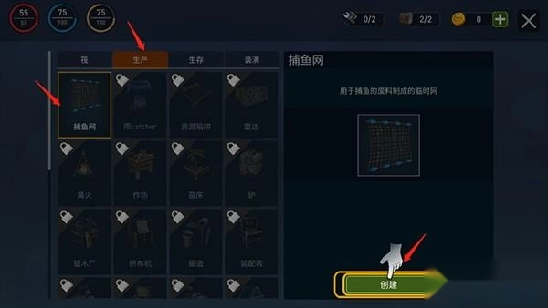 打开工艺菜单,就能设置捕鱼网获取食物;