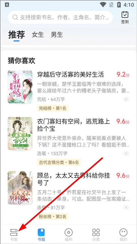 打开并登录后进入书城页面,用户可以在书城中浏览推荐、男生、女生等分类的书籍,也能搜索自己想看的书,还可以点击书架。