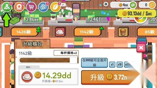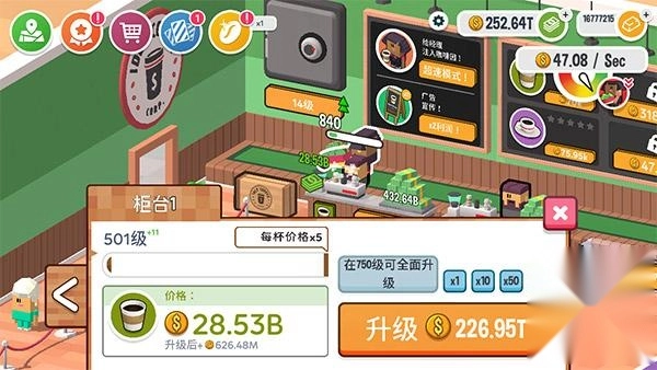 1、开设柜台,提升柜台等级通过开设柜台,选择售卖的咖啡种类,升级可增加咖啡售卖的价格,同时达到一定等级柜台品质也会得以提升,大大增加效益。