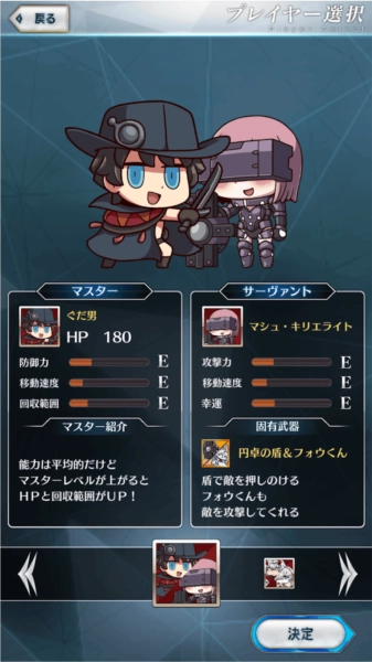 游戏初始可选咕哒组与卡多克组两个阵营,每组都搭配各自专属从者——比如咕哒的搭档是玛修,卡多克则与皇女同行。每次通关后会解锁新的御主-从者组合,且每位御主和从者都拥有独特的被动技能与主动技能效果:咕哒属于均衡型御主,防御力、移动速度和道具回收范围均处于中等水平,被动技能为扩大回血道具的回收范围;卡多克的防御力与移动速度较高,但道具收取范围相对较小;奥菲利亚的道具收取范围则格外大,同时移动速度也处于较高档位。