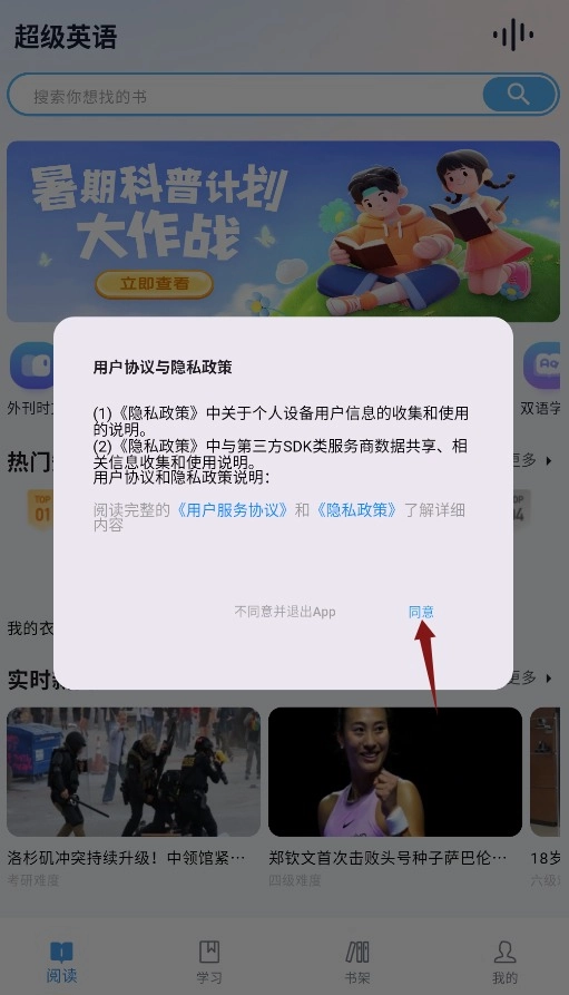 首次打开应用时,需要点击同意用户协议与隐私政策,确认之后才能进入主界面。