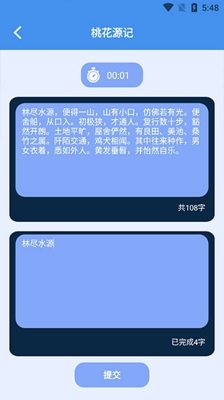 以“桃花源记”为例,底部设有打字显示区域,一旦开始打字,上方的计时器便会启动,以此协助校准和对比打字所用时间。