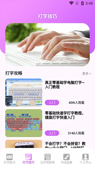 第二页为“打字技巧”板块,支持上下滑动浏览打字攻略与快速入门教程,内容涵盖电脑键盘操作及手机拼音输入相关指导。