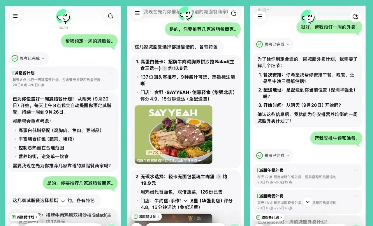 小美还能帮你高效搞定各类规划类任务,拿“预定一周减脂餐”来说,她会主动从你的历史订单数据和日常消费习惯里,提炼出口味偏好,像清淡低脂这类。在这个基础上,小美会把一周减脂餐的组合建议,自动整理成两种实用的结果:一种是清楚易懂的待购清单,让你能自己去采购食材做饭;另一种是直接的下单入口,能一键连接外卖平台完成购买。