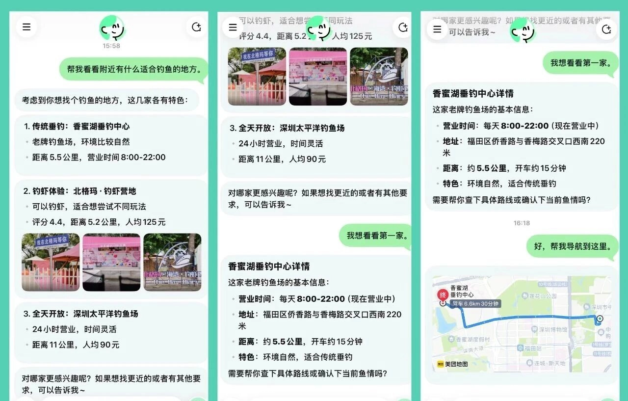 小美没有只是用地图进行简单搜索,而是仔细分析用户的需求,全面考量安全、趣味性、性价比等多方面因素,最终推荐出比较理想的地点;选定地点后,她还能调用美团的地图功能,协助用户顺利抵达目的地。